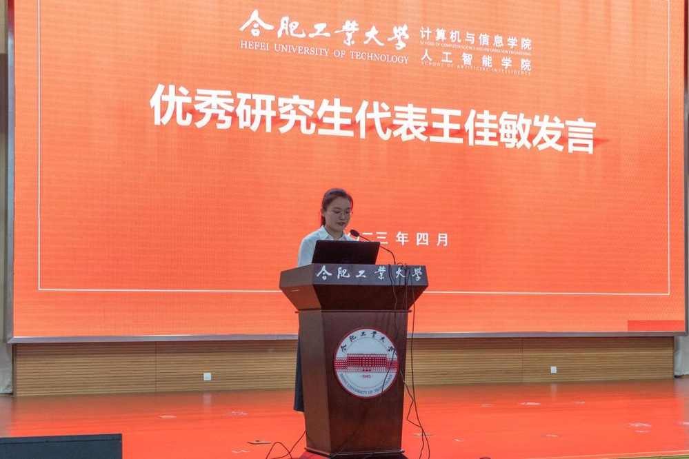 正处级组织员郑荣美宣读了开云kaiyun官方网站2021-2022学年先进个人表彰决定。国家奖学金获得者、安徽省优秀毕业生、计算机科学与技术2020级硕士研究生王佳敏作为学生代表发言,她结合个人经历,号召同学们要以理想照亮前行的路,以奋斗书写青春答卷,以吃苦锤炼过硬本领,以担当彰显初心使命,做“眼中有光”、“脚下有路”、“手上有招”、“肩上有责”的新时代好青年。
