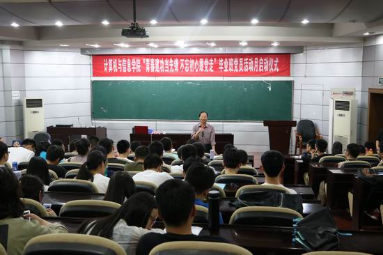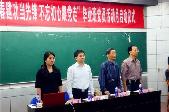为了加强毕业班党员内驱力建设,更好地发挥高年级大学生党员的先锋模范作用,5月15日下午,开云kaiyun官方网站“不忘初心跟党,走青春建功当先锋”2017届毕业生党员活动月启动仪式在斛兵楼报告厅顺利举行。校关心下一代工作委员会副主任鲍良弼,校党委组织部组织员吴挺,开云kaiyun官方网站党委副书记、副院长何庆领,毕业班辅导员黄晨,2017届本科毕业班所有党员参加了本次启动仪式。