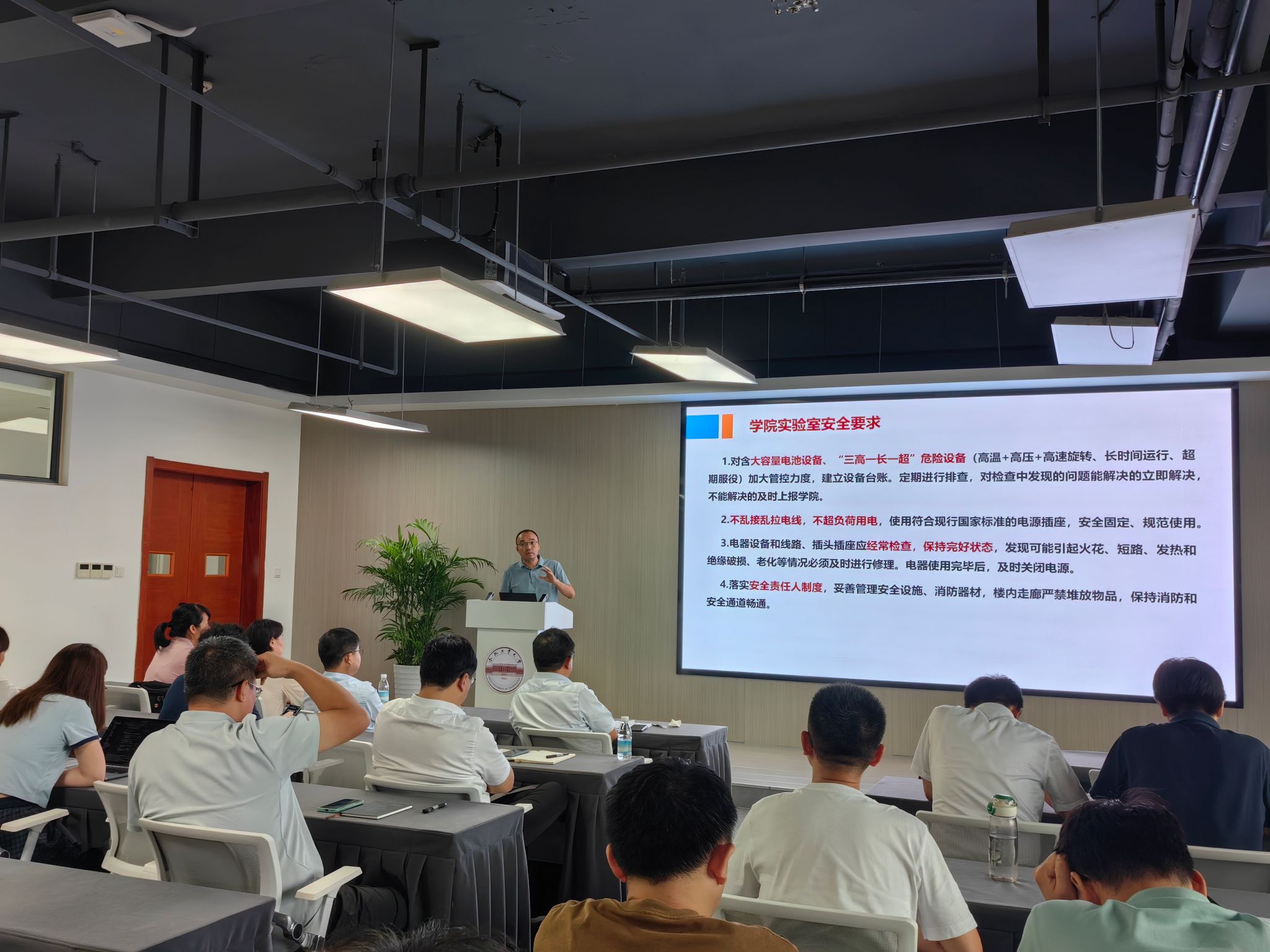 王辉副院长就实验室安全管理工作进行提醒,要求加强对大容量电池设备及高危设备的台账管理,规范用电行为,定期排查电气安全隐患,并严格落实安全责任人制度。