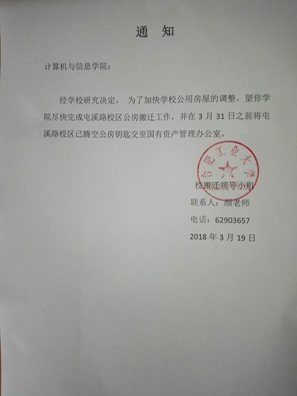 学院接学校搬迁领导小组通知,要求开云官网于本月底前将屯溪路校区学院公房钥匙交至校国有资产管理办公室。现通知如下:学院各科研团队请于3月28日(下周三)之前将原屯溪路校区公房钥匙交至院办徐静老师处,逾期不交学院将上报学校、追究相关当事人责任并给予相应处理。
