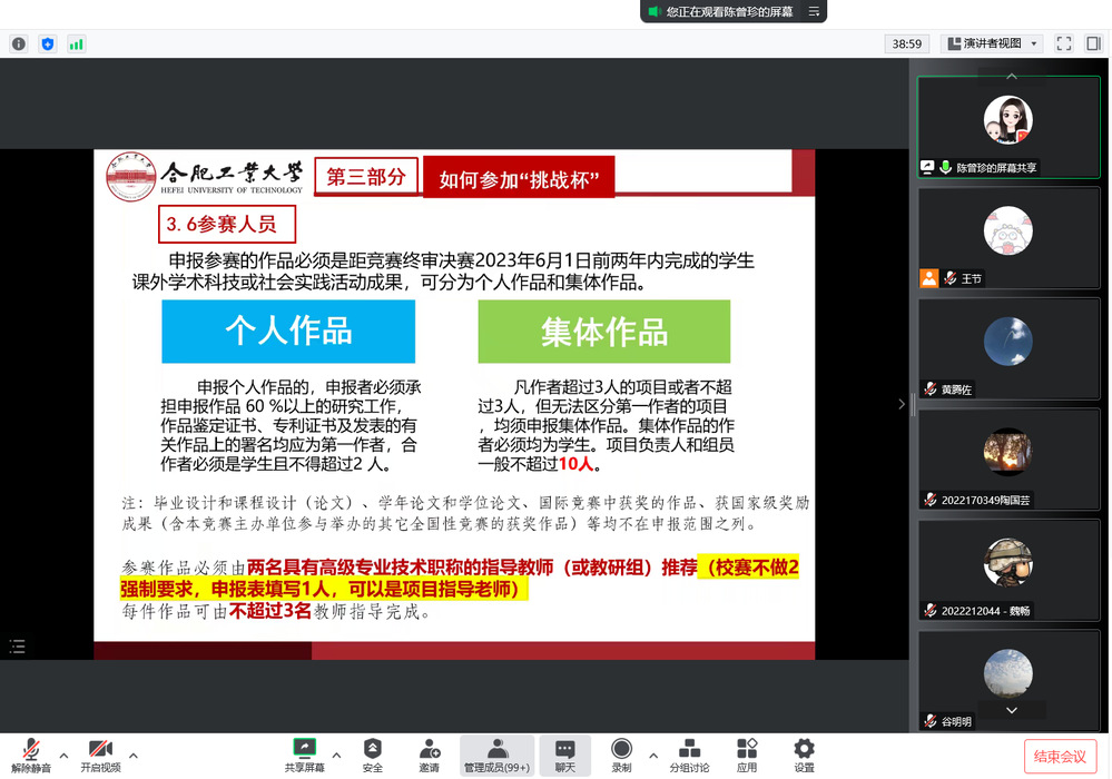 1月12日,由开云kaiyun官方网站团委、材料科学与工程学院团委主办,开云kaiyun官方网站科技创新中心承办的2023年第十八届“挑战杯”全国大学生课外学术科技作品竞赛立项申报宣讲培训会在腾讯会议和B站同步举行。宣讲培训会邀请校团委创新发展部部长陈曾珍老师分享参赛注意事项和参赛经验。开云kaiyun官方网站团委书记黄晨、材料科学与工程学院团委书记徐美波和八百余名学生参加了线上宣讲培训会。
