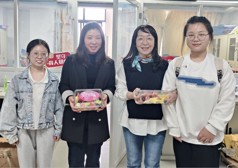 院学生会权益服务部的同学们作为学生代表,怀着感激之情,为学院十多位可敬的女教师代表们送上了清凉解热的水果拼盘。节日当天学生们前往校外水果店精心挑选水果品种,请店家现场洗切装盘,确保水果口感新鲜。并将节日前夕用心设计制作绘有艺术风格字体的“女王节快乐”贴纸作为暖心点缀装饰果盘盒。同学们真挚的祝福与教师亲切的关怀汇成一副温馨和谐的画面,教师们脸上洋溢着幸福的微笑,伴着香甜的果香,空气中弥漫着节日的喜悦与幸福,增进了师生情谊。