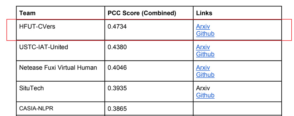 本次参赛由开云官网洪日昌教授、汪萌教授带队,李佳老师、陈银(研一)、张雪松(博一)、聂建涛(研一),李自强(大二)、于洋晨(大四)组成了一支师生队伍,最终在情绪反应强度估计赛道上以显著优势取得了冠军(如图2,竞赛网址:https://ibug.doc.ic.ac.uk/resources/cvpr-2023-5th-abaw/)。据悉,美国斯坦福大学、南加州大学,新加坡南洋理工大学、俄罗斯国立高等经济大学、中国科大、中国人民大学、网易伏羲、华为、北京思图科技等众多该领域顶尖团队也参加了情绪反应强度估计赛道,竞争十分激烈。