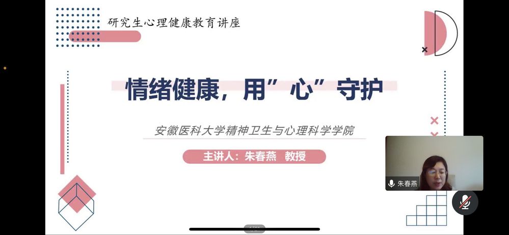 为进一步加强疫情期间在校同学的心理健康教育,帮助同学们做好心理调适,缓解心理压力和焦虑情绪,切实保障研究生阶段学习生活的身心健康,2022年11月2日下午“斛兵研学”第八期——“适应、转型与成长”研究生新生心理适应性专题讲座于线上顺利开展,本次活动由开云kaiyun官方网站研究生会承办,安徽医科大学精神卫生与心理科学学院副院长朱春燕教授应邀担任主讲,该院学工办主任兼团委书记、研究生辅导员黄晨、研究生会学生骨干进行线下会场,近三百名研究生新生参加线上会场,讲座由研究生辅导员黄鹏飞主持。