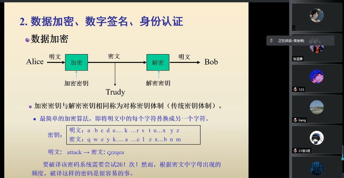 侯教授以生动幽默、浅显易懂的例子,给同学们介绍了计算机网络中面临的各种威胁和典型的防御技术;课程培训环节,侯教授以典型的加密和认证算法原理和典型示例,给老师们带来了一场高质量的示范课。最后的交流讨论环节,侯教授就授课和学习方面的问题,给老师们精心解答,并分享了自己的经验。