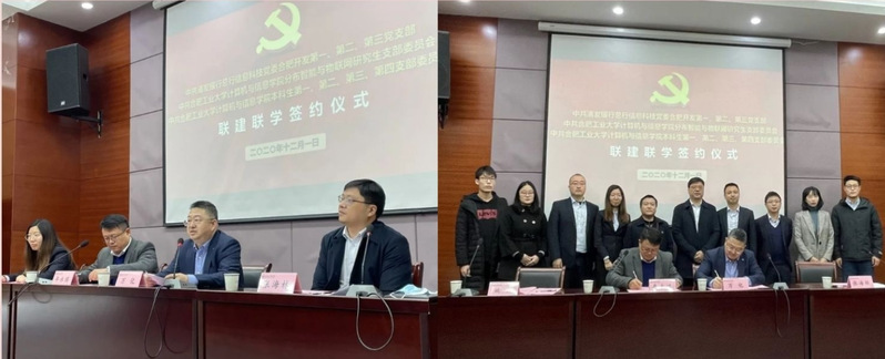 为深入学习贯彻党的十九大精神和习近平新时代中国特色社会主义思想,深化校企合作,搭建育人实践平台,12月1日,学院党委分布智能与物联网研究所党支部、本科生第一、第二、第三、第四党支部与浦发银行总行信息科技党委合肥开发第一、第二、第三党支部在翡翠湖校区翡翠科教楼第五会议室举行“党建引领聚合力,校企合作促发展”为主题的联建联学系列教育活动。浦发银行总行信息科技党委委员、总行信息科技部副总经理万化,开云kaiyun官方网站党委书记年永琪,党委副书记兼纪委书记张海林以及本次联建联学相关党支部的支部书记、支委、企业党员和师生党员代表参加了签约仪式。