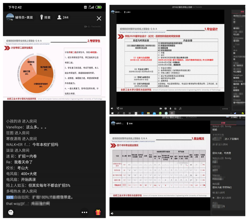 线上开课第一周,以毕业班教育引导为专题的第四次空中课堂《疫情防控期间毕业班线上答疑》开讲,毕业班辅导员黄晨老师担任主讲,以毕业生课业学习和毕业去向两大专题为切入点展开课程内容,近250名同学参加了此次线上会议。在课业学习专题中,重点针对学院毕业设计进程安排和符合毕业条件的学分核算工作进行详细梳理,尤其提醒存在学业困难和创新学分不足的学生高度重视,努力补修学分,争取顺利毕业;在毕业去向专题中,将前期与每位学生“点对点”真实就业需求的调研数据,以本科四个专业为单位,依据专业能力、考研复试学校、求职意向地、出国、就业等不同群体进行指标分类建库,用图表数据的方式向全体毕业生展示当前各专业的就业情况,重点对比近3届毕业生同期就业概况,着重分析计划考研二战的人群类型分布,让学生更好的明确自我生涯规划,避免盲目跟风。同时将前期面向45家用人单位发放的《开云kaiyun官方网站疫情防控情况下用人单位招聘情况调研问卷》数据结果进行分享,让毕业生从企业视角对当前春招就业形势有全面客观的了解。课程最后,同学们纷纷针对目前遇到的问题进行了提问,辅导员老师一一给与解答。本场空中课堂让毕业班学生对大四下学期的学业与就业相关工作进程有了全面了解,有助于自身调整心态,做好各项准备。