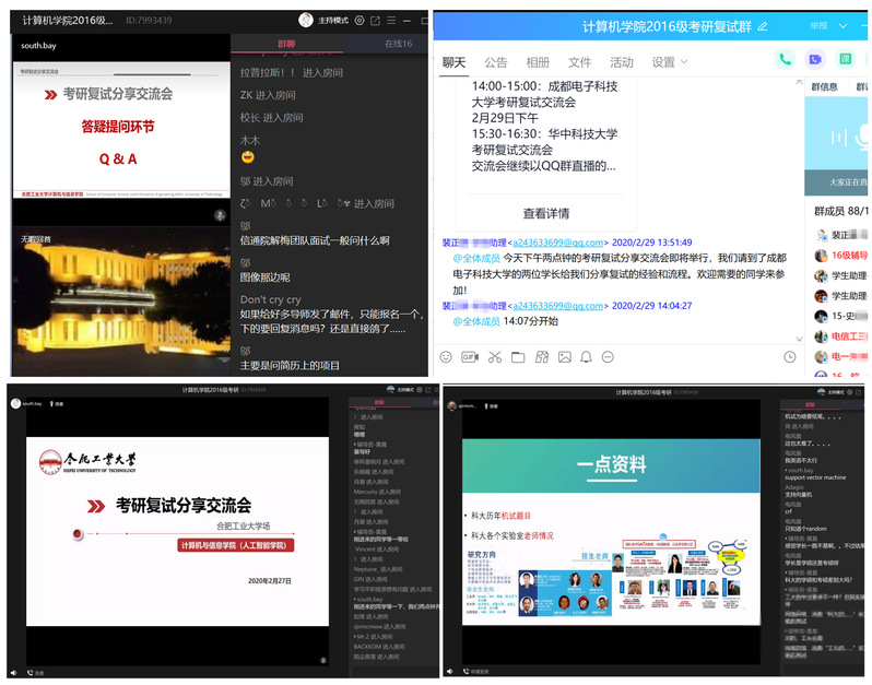 线上开课第二周,以提升考研复试能力为专题的4场空中课堂《考研复试经验分享》开讲,分别是“中国科学技术大学”专场、“成都电子科技大学”专场、“华中科技大学”专场和“开云kaiyun官方网站”专场。四个专题课程特邀请相关高校的9名2015级优秀学长学姐担任主讲,累计百名学生参加学习。学院前期将考研拟复试情况进行数据分析,结合学生实际需求,面向报考最多的四所高校,开展针对性的复试经验交流课程。四门专题课程中2015级优秀学子均结合自身经历,围绕专业课学习方法、复试准备、考前心态调整、面试建议、调剂准备等方面来和大家分享考研相关经验,在学院考研复试QQ群中都分享了考研复试的相关资料。同学们通过弹幕提问的方式踊跃参与,积极互动。本次各个专场的考研复试分享交流会为考研学习提供了一个良好的交流机会和交流平台,让考研学子精准把握考研复试的具体情况,缓解了疫情情况下考研学子的复试焦虑。