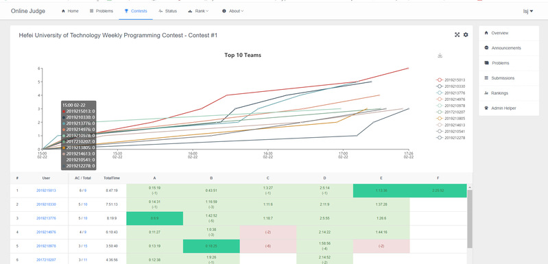 正式比赛前,主办方将相关信息在官方群中发布,提醒参赛者比赛注意事项。在系列周赛的答题过程中,各志愿者在线上以公正、公正、公开、不透露问题答案为前提,为大家解决各种技术问题确保比赛顺利进行,每次比赛后志愿者将答案发在官方群中供大家学习交流,并由工作人员进行代码查重以确保比赛公平,三次比赛顺利完成后进行成绩汇总排名。赖溢龙同学和张志伟同学获得本次比赛一等奖,罗庭辉等四位同学获得本次比赛二等奖,张荣杨等六位同学获得本次比赛三等奖。