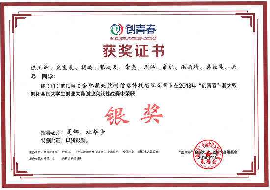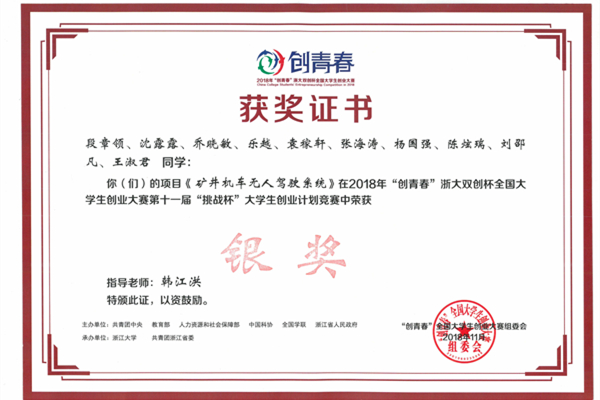10月31日至11月4日,由共青团中央、教育部、人力资源和社会保障部、中国科协、全国学联等主办的2018年“创青春”全国大学生创业大赛终审决赛举行,来自全国31个省(自治区、直辖市)以及新疆生产建设兵团、香港特别行政区、澳门特别行政区的197所高校的369件作品入围终审决赛。学院参赛作品《矿井机车无人驾驶系统》和《合肥星北航测信息科技有限公司》在终审决赛中斩获银奖。