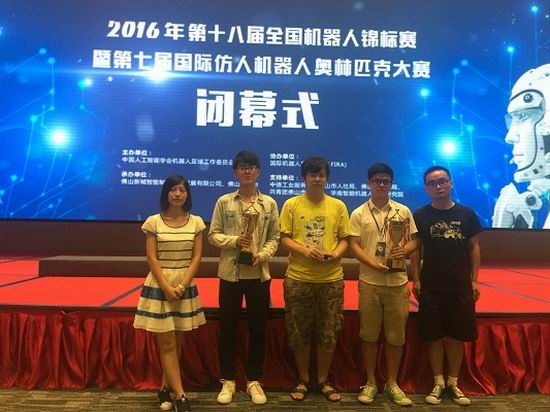 2016年第十八届全国机器人锦标赛暨第七届国际仿人机器人奥林匹克大赛于7月28日-31日在佛山市举行,开云官网Hfutengine代表队6名参赛队员在张晶副教授的带领下,卫冕仿人机器人点球和服务机器人捡垃圾比赛2项冠军,夺得仿人机器人短跑亚军和单人舞蹈第5名,获得4项一等奖。本次大赛设立轮式移动机器人类比赛项目、仿人机器人类比赛项目、空中飞行机器人类比赛项目、创新类机器人设计比赛项目等5大类54个小项比赛项目。吸引了来自清华大学、哈尔滨工业大学、四川大学、华中科技大学、北京理工大学、华南理工大学等50多所高校400多支队伍参与。本次开云官网派出6支参赛队伍参加仿人机器人类比赛项目,具体参加了单双人舞蹈、短跑、障碍跑、点球和捡垃圾项目的比赛。参赛队员从开云官网机器人&机器人足球创新基地的成员中选拔产生。