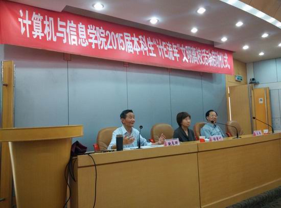 随后,校关工委鲍良弼老师给毕业生做了一场题为《给毕业班同学送行》的报告会,鲍老师在报告中肯定了计算机学院的学生的优良的综合素质和较强的动手能力,并且结合李克强总理报告中提到的“2025计划”,提醒同学们要紧紧的抓住这一历史性的机遇,打破“缺核心技术、缺民族品牌、缺原始创新”的现状,并且希望同学们在未来的工作岗位上不懈进取,为中华民族的繁荣富强作出贡献。