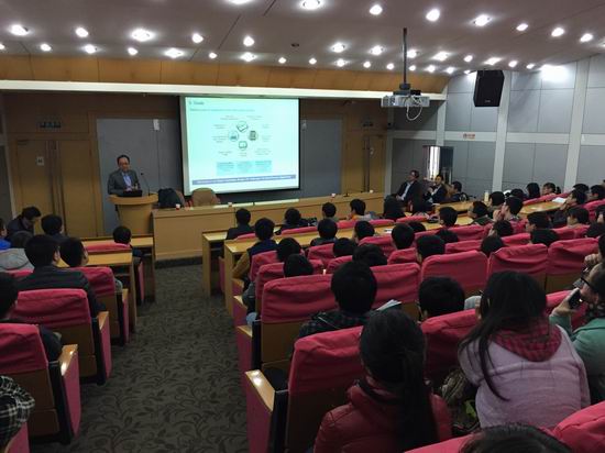 会议结束后,宣讲会分两场进行。上午10:00和下午2:00,黄国熙高级副总监、何圣钢副总监、陈泰然助理总监在屯溪路校区学术活动中心二楼小报告厅、翡翠湖校区建艺馆报告厅,分别面向大三和大二计算机专业、信息安全专业同学,就花旗银行及其金融科技教育联合培养项目、“花旗杯”金融创新应用大赛做了精彩介绍,现场提问环节,同学们更是积极提问,掌声不断。