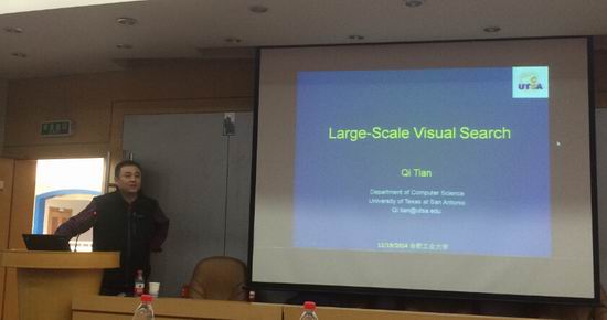 田奇教授首先完整地回顾了视觉信息检索的研究发展历程,介绍了该研究方向的发展现状。通过生动的分析与论述,田教授进一步向大家介绍了大规模视觉信息检索所需要解决的四项关键技术;并逐一展示了所领导研究团队取得的丰硕学术成果。报告结束后,田奇教授现场为在座师生演示了其团队开发的视觉信息搜索原型系统,并通过实例详细地分析了实验结果反映的各种现象与规律。本次报告引起了在座师生很大的兴趣,多位老师和同学在报告间隙和结束时与田奇教授进行交流与互动。