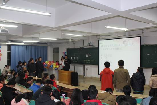 本次比赛分三个环节,共六组队员参赛,分为两个战区,先进行战区内部淘汰赛,赛制采用车轮战战术,根据小组成员答题对错情况淘汰队员,直到小组队员全部淘汰,则剩余人员最多的小组进入复赛,第二环节采用同样赛制,经过激烈的竞争,仅余两组队伍进入最终决赛。比赛过程中,选手们表现镇定,自信果断,为自己的队伍奋力拼搏。随着比赛环节的深入,选手们也逐渐紧张起来。随后进行的精彩二胡表演和吉他弹唱以及现场互动环节,现场气氛逐渐达到高潮,现场欢声笑语不断。第三环节分必答题、抢答题和加赛题三部分,小组成员积极思考快速抢答,分数你追我赶,交替上升。现场观众情绪高涨,情不自禁纷纷在旁“暗语传送”。随着竞赛题型变化多样,难度增大,比赛也进入了白炽化阶段,但这丝毫没有影响选手们的精彩表现,快速而准确的答案,赢得了现场同学们的阵阵掌声。最终,经过激烈角逐,队名为“中国少年先锋队”的小组赢得了本次比赛。