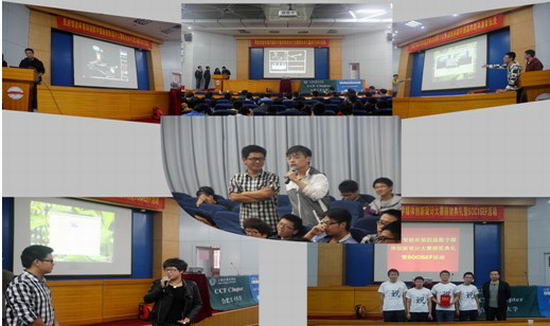 活动开始,路强老师首先介绍历届数字媒体创新设计大赛的参赛及获奖情况,并对本届大赛中从众多参赛作品中脱颖而出的6位作品给予了充分肯定。随后南国君副书记对本次大赛致辞并对广大同学提出殷切期望,希望同学们能够借助此次比赛,提高对“数字媒体技术”的认识,同时增强大学生的实践创新意识和对创新能力的培养。比赛分为现场演示、ppt答辩和现场互动三个环节,现场演示和ppt答辩精彩纷呈,博得了现场观众的阵阵掌声,互动环节更是充分调动了现场同学们的积极性,将现场气氛推向了高潮。经过专家以及大众评委共同评审,本着公开、公平、公正的原则,最终评审出一、二、三等奖。随后孙晓老师对所有作品进行了深刻点评,并对下一届数字媒体创新设计大赛提出了期望和祝福。