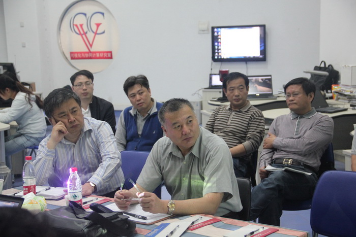 VCC团队负责人刘晓平教授首先介绍了近年来的发展轨迹,从仿真、可视化和协同设计三条路线总结了过去的工作,剖析了自身的不足,立足于产业发展的热点对未来实验室的发展进行了初步规划。VCC的年青教师也各自发表了自己在教学科研工作中的体会和想法,领导们认真倾听大家意见并发表了自己的见解。最后,徐校长从规划依据、产业化、申请大项目、与军工结合以及拓展文化产业五个方面进行了具体的指导,希望实验室在基地建设和人才引进工作上抓紧学习国内外先进实验室的模式,提高自身实力,成为工大一支强有力的研究团队。
