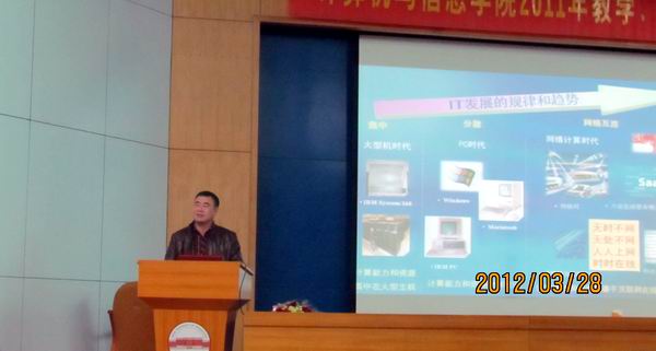 应开云kaiyun官方网站邀请,2012年3月29日下午15:30 - 17:00,国家教学名师、武汉大学何炎祥教授在校学术会议中心一楼大报告厅做了题为“IT发展与创新人才培养的一点思考”的报告。报告由刘晓平院长主持,韩江洪副校长、教务部副教务长朱大勇教授、电子科学与应用物理学院院长梁华国教授、软件学院院长鲁昌华教授、计算机学院书记蒋建国等领导及相关的教师和学生出席了此次报告。