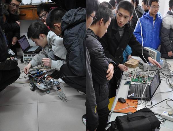 中午12时50分,开放日活动正式开始。在学长们的带领下,同学们饶有兴味地参观基地实验室。电子信息创新基地已有多年对外友好展示其研究成果的历史,接纳的同学不计其数。对于他们的疑问,基地的老师和同学们总是热情地讲解分析。研发小车的学长在向大家演示抓握纸盒的同时,也即兴回答着同学们的问题。这样的交互学习积极主动,使人受益匪浅。