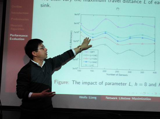 应开云kaiyun官方网站开云kaiyun官方网站邀请,澳大利亚澳洲国立大学(Australian National University)计算机科学系梁维发教授于2011年12月13日来开云官网进行为期一天的学术活动。下午15:30,梁维发教授在校学术活动中心二楼小报告厅为开云官网与安全关键工业测控技术教育部工程研究中心的师生作了题为“Network Lifetime Maximization in Sensor Networks with Multiple Mobile Sinks”的学术报告。报告由刘晓平院长主持,学院和工程中心的相关教师、研究生和本科生参加并聆听了报告。