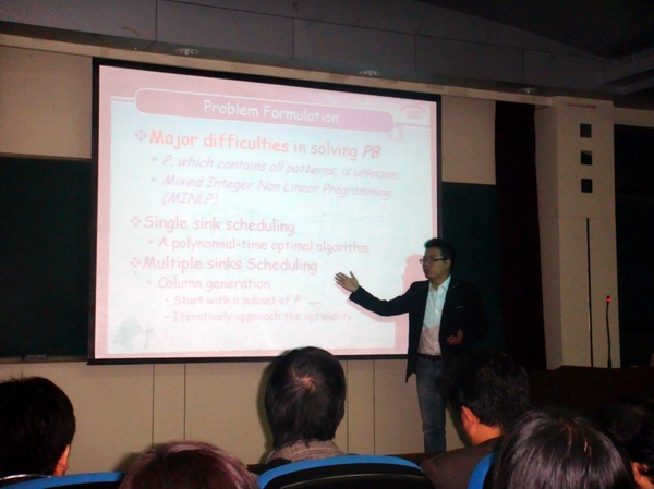 谷雨博士在报告中首先介绍了在无线传感器网络中由于独特的汇聚传输模式造成的网络瓶颈,同时介绍了近年来其他研究者为了解决此问题提出的基站调度的手段。然而,基站调度问题通常和路由问题是紧密的结合在一起的,因此很难得以完美的解决。针对此问题,谷雨博士提出了一种新的思路,将基站调度问题从时间域中无损的转化到空间域中求解,因此降低了求解的难度;同时还证明,如果只有一个基站,基站调度问题是可以在多项式时间内完美求解;并给出了相应的最优算法。