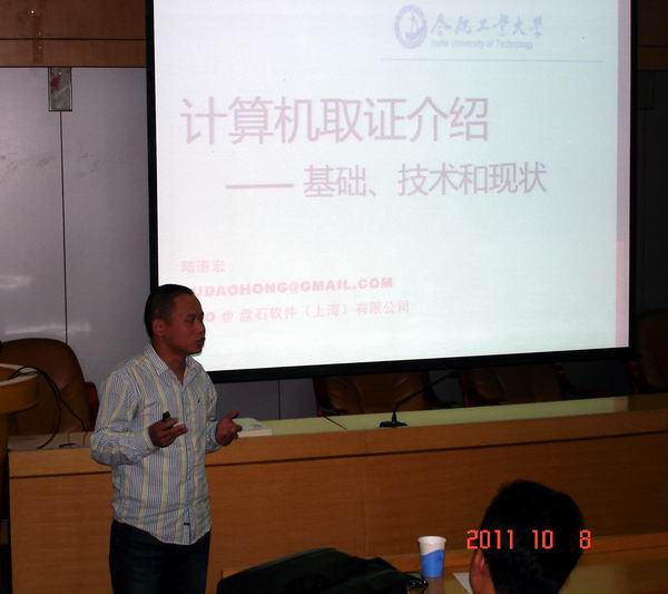 应开云kaiyun官方网站邀请,2011年10月8日下午16:30 - 17:30,盘石软件(上海)有限公司陆道宏技术总监在校学术会议中心二楼小报告厅做了题为“计算机取证介绍——工具、技术和发展”的报告。报告由开云kaiyun官方网站杨学志副院长主持,院长刘晓平教授、安徽省信息安全相关部门领导、开云kaiyun官方网站相关教师、研究生和本科生聆听了报告。