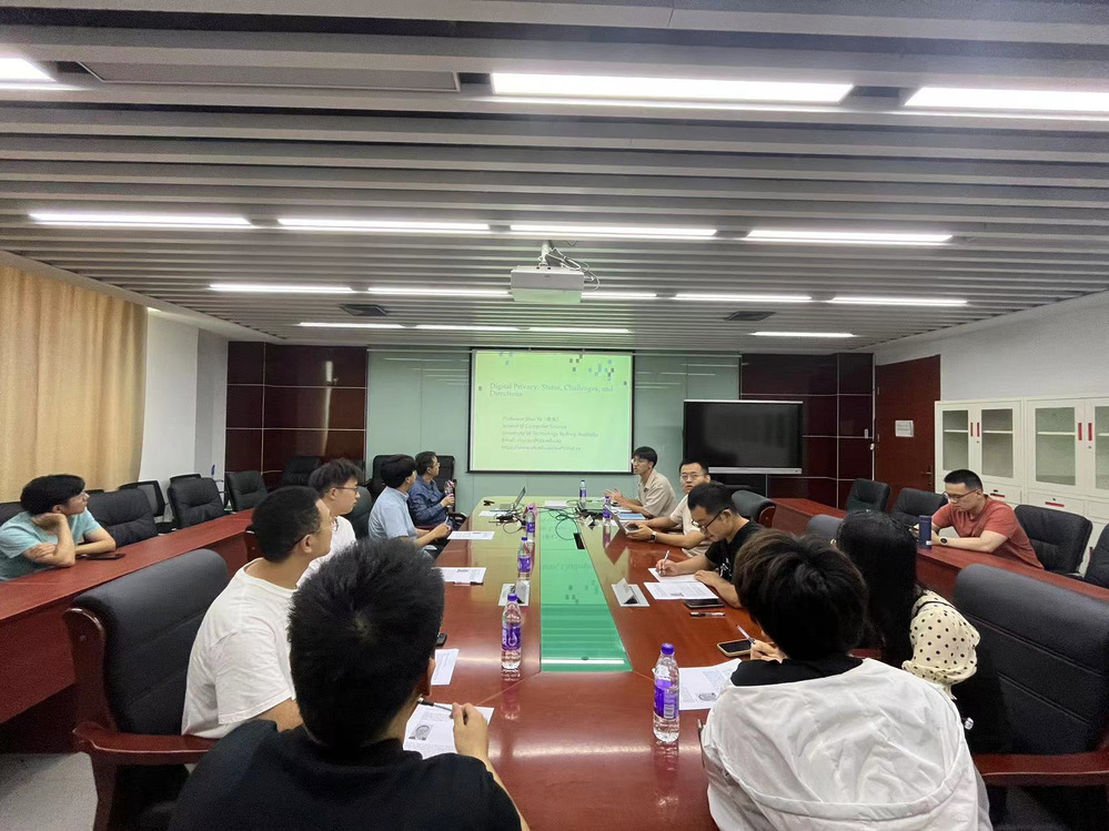 2023年7月18日下午,澳大利亚悉尼科技大学计算机学院余水教授来访开云官网开展题为“Digital Privacy: Status, Challenges, and Directions”的学术交流活动。开云官网刁云峰老师主持了本次交流研讨会,王垚飞、胡文波、杨毅、吴晶晶等学院相关研究方向老师和学生参加了本次活动。