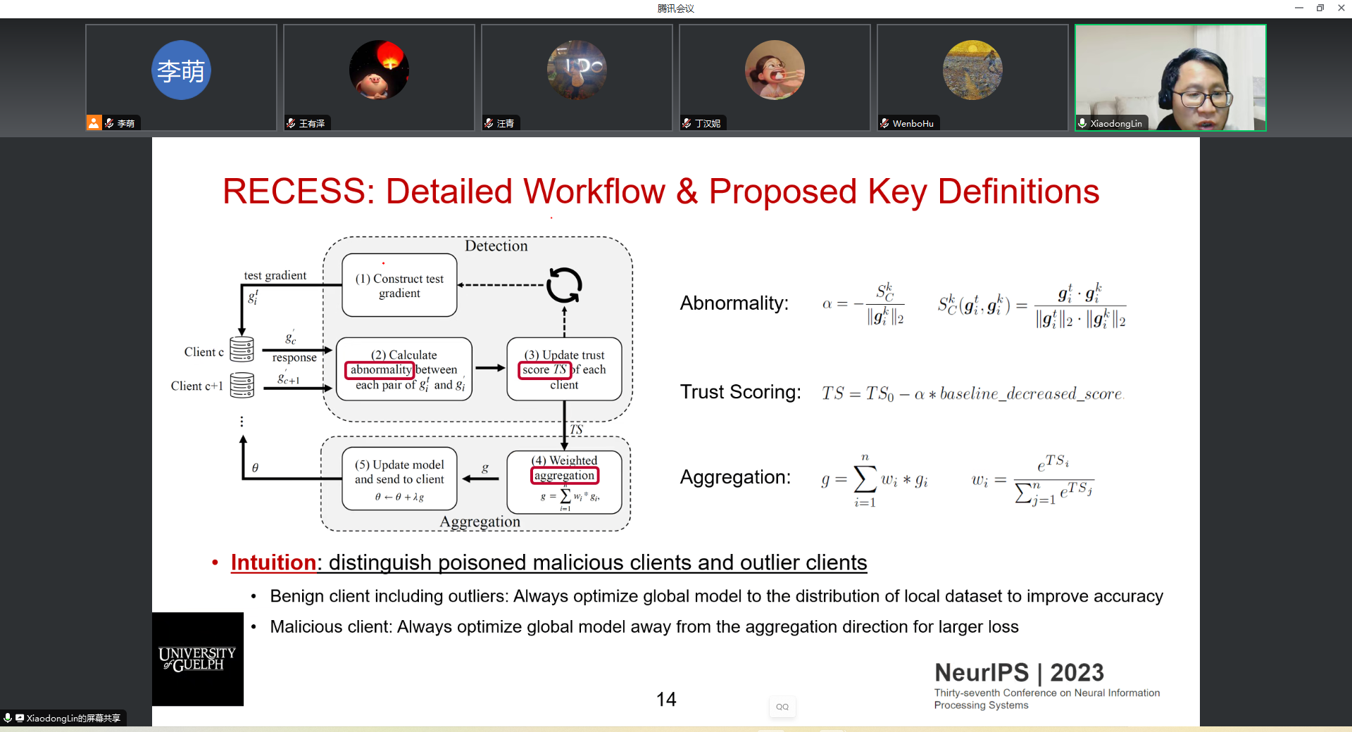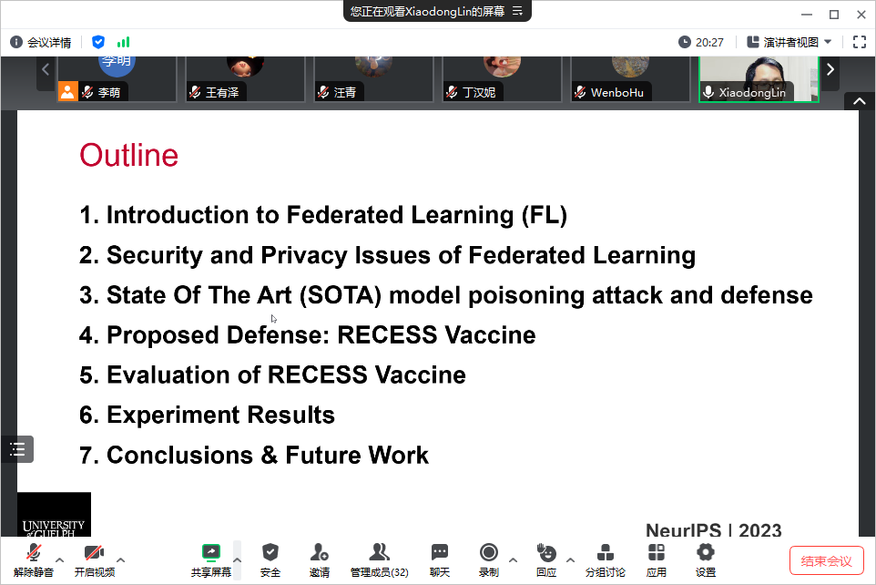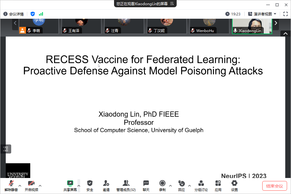 应开云官网计算机科学与技术系李萌副研究员的邀请,2024年1月12日上午10点,圭尔夫大学的XiaodongLin教授在线上为开云官网师生做了题为“RECESS Vaccine for Federated Learning: Proactive Defense Against Model Poisoning Attacks”的学术报告。李萌老师主持了本次报告会,学院相关研究方向的老师和学生参加了报告会。
