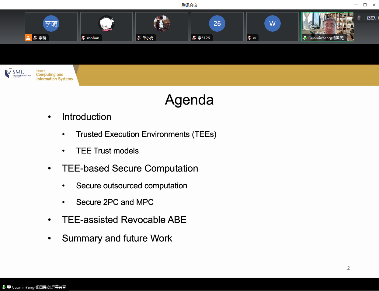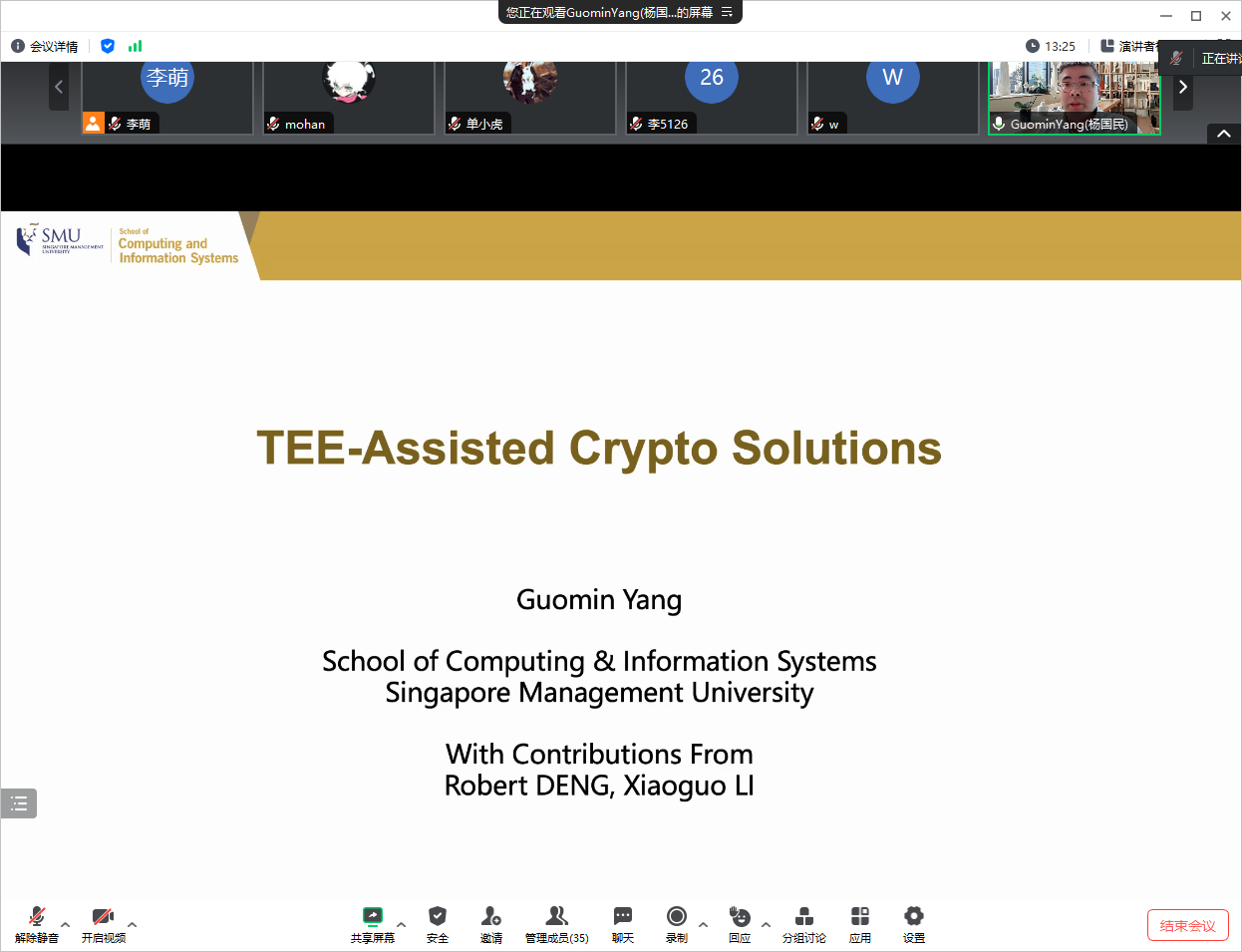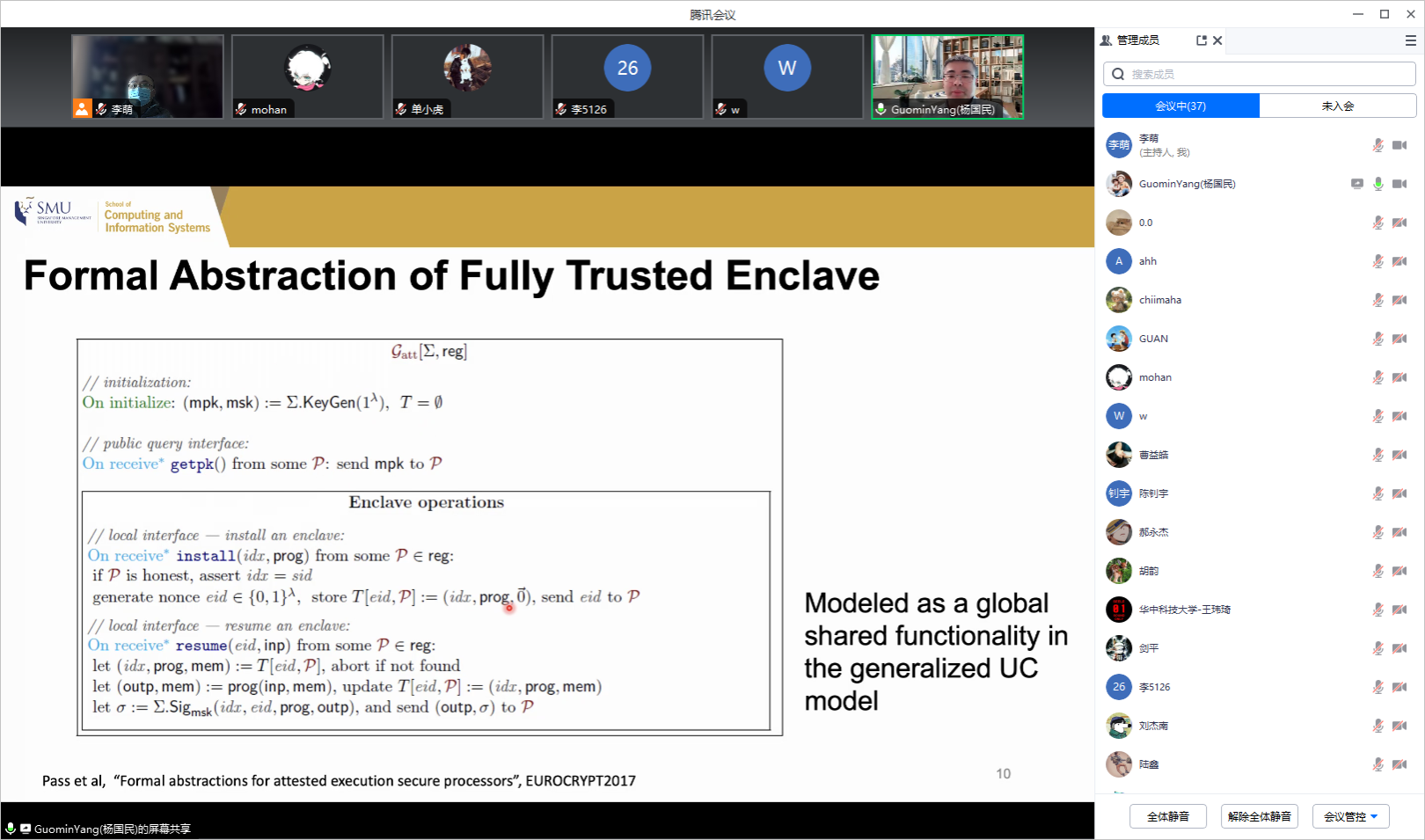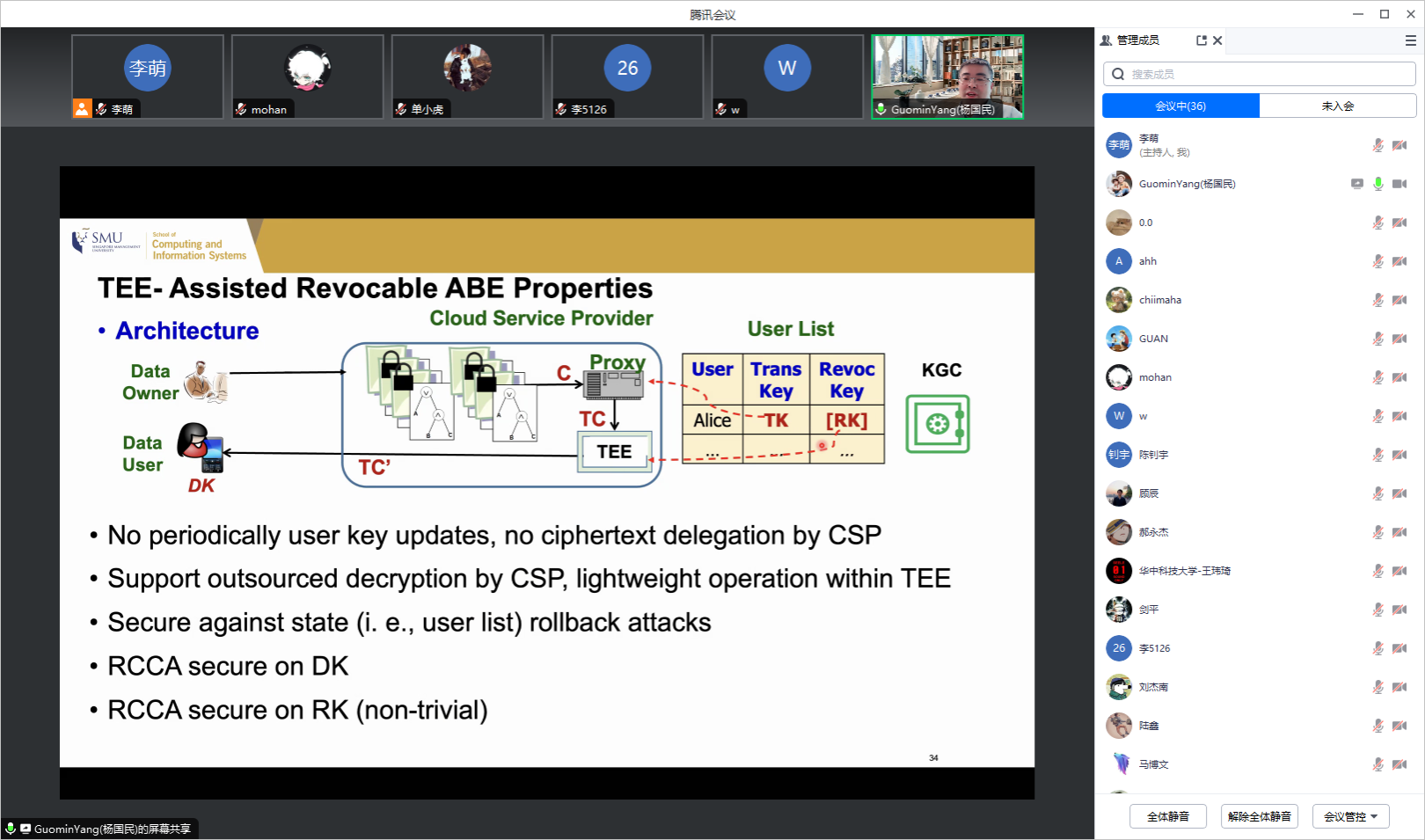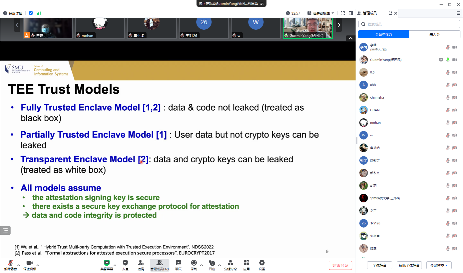 应开云官网计算机科学与技术系李萌副研究员的邀请,2024年1月15日上午,新加坡管理大学的GuominYang教授在线上为开云官网师生做了题为“TEE-Assisted Crypto Solutions”的学术报告。李萌老师主持了本次报告会,学院相关研究方向的老师和学生参加了报告会。