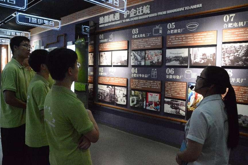 合钢旧址,工业遗产。合肥东部新中心展览馆建于合钢旧址,展馆旁废弃的高炉和厂房宛如古老的钢铁巨兽匍匐于此,低诉过往。成员一行人来到这里,通过主题影片、讲解员细致的介绍以及数字沙盘的展示,团队成员了解到安徽工业的起源,沪企迁皖,瑶海成为合肥工业摇篮。展览馆有“工业底蕴、岁月遗珍”、“十里练营、工业辉煌”等主题,成员们看到合钢、合肥无线电二厂、合肥搪瓷厂等老企业屡获国家荣誉,毛泽东、邓小平等领导人视察合肥的历史影像,赞叹于瑶海区工业发展的辉煌历史。2018年,合钢成为国家工业遗产,在继承老工业文化的同时,瑶海人开始憧憬转型发展的美好前景,再续华章。