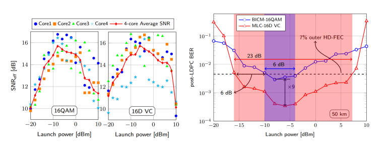 开云官网师生本次获得的高分论文“Experimental Demonstration of 16D Voronoi Constellation with Two-Level Coding over 50km four-Core Fiber”,针对未来基于多芯光纤技术的扩容优势和挑战,提出了一种基于16维联合编码调制(MLC-16DVC)的多芯光纤传输方法(如图1所示)。经过单跨50公里四芯光纤传输实验验证(传输实验系统如图2所示),相较于传统的二维独立QAM调制,所提出方法可以容忍更大的芯间信噪比差异影响,并在外级联硬判决纠错容限处可提供6dB的光功率增益(如图3所示)。