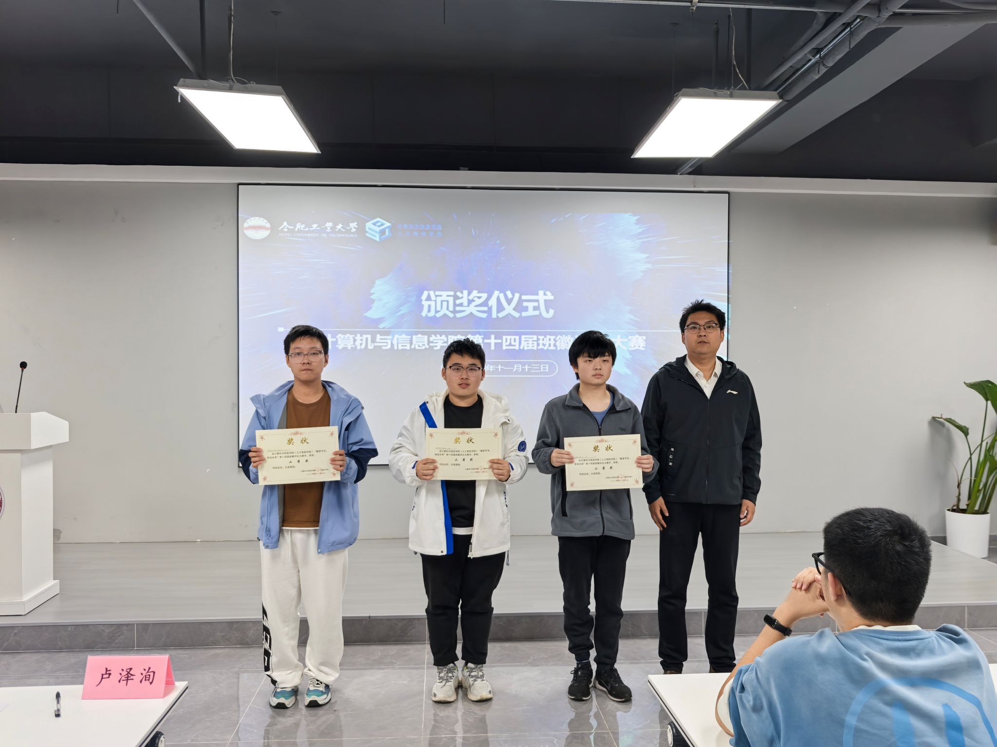 班徽设计大赛自11月初启动以来,2024级10个班级参加了比赛。现场答辩环节,各个参赛班级通过PPT汇报的方式介绍班徽的设计灵感、讲述班徽背后的班级故事。答辩选手依次从班徽设计的理念、灵感来源、设计过程等方面依次介绍了班徽中每一个元素代表的含义和对班级未来的期望。答辩过程中,班级独特的设计理念,给在场的评委和观众以视觉的震撼和心灵的享受,引得台下掌声连连。经过答辩评选,最终计算机科学与技术24-4班和信息安全24-1班荣获一等奖,计算机科学与技术24-1班、电子信息工程24-2班,通信工程24-1班荣获二等奖,计算机科学与技术24-2班、计算机科学与技术24-3班、电子信息工程24-1班、电子信息工程24-3班、通信工程24-2班荣获三等奖。