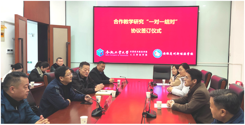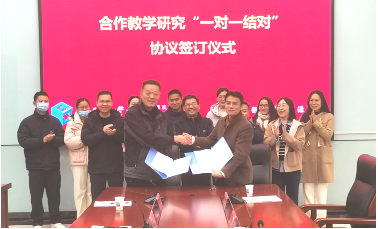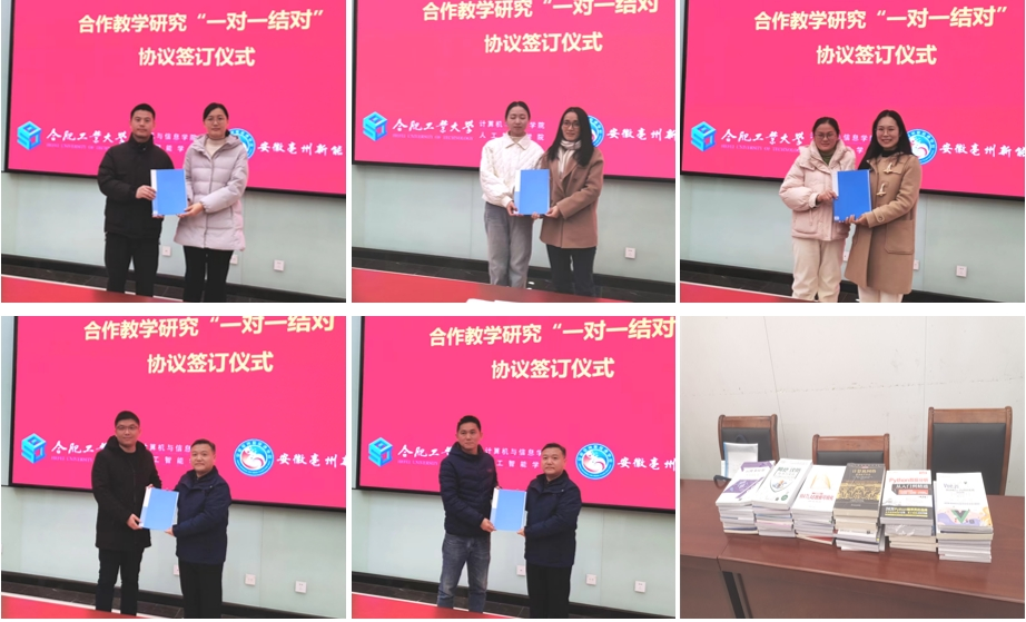 随后,开云官网与新能源学校进行了合作教学研究“一对一结对”签约仪式。现场,双方学校的5对教师“牵手”成功(图3),他们将在接下来的6个月里,合作开展教学、科学研究,形成一定的研究成果,并进行成果的合作发表,另外,我方教师还将协助对方进行学历提升的各项准备工作,包括考研的复习和备考。仪式最后,还进行了计算机类优秀图书的捐赠。