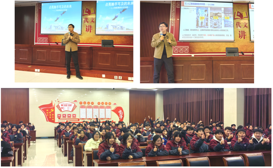在利辛县新能源学校,刘建老师为200余名学生做了“点亮触手可及的未来”人工智能技术科普讲座,生动地介绍了人工智能技术在我国各行业的最新应用,同时把大家学过的函数、向量&矩阵、概率统计等知识结合AI方法,解决了现实生活中的问题。讲座不仅让广大学生全面认识了人工智能的基本原理和各种应用,开阔了眼界,而且激发了学习新技术的浓厚兴趣。