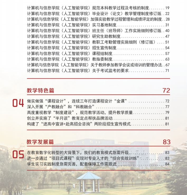 该手册包括“新进教师篇”、“质量把控篇”、“教学四季图”、“教学特色篇”和“教学发展篇”五个部分,涵盖了本科教学工作的各个环节,实操性强,干货满满,可以为学院全体教师提供教学指导和参考。