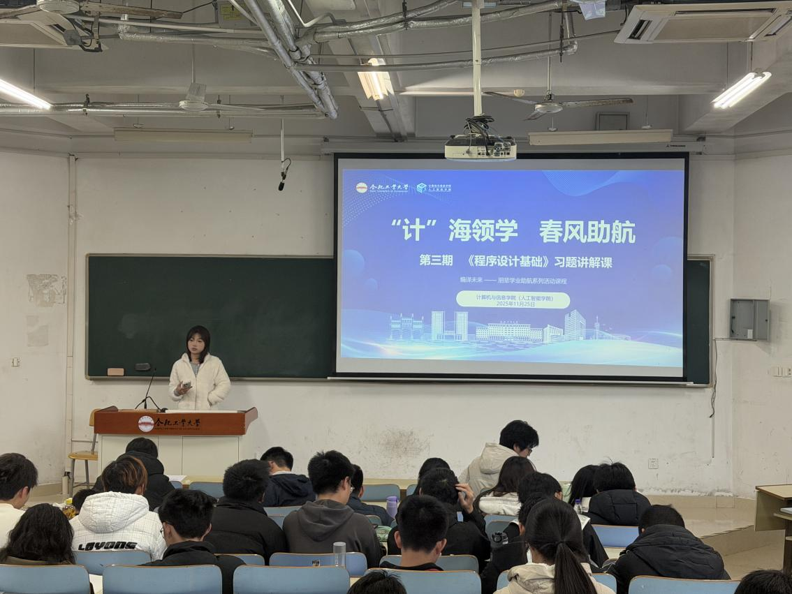 为帮助大一新生巩固知识、提升学习效果,降低课程挂科率,11月25日,学院在翠11教102举办《程序设计基础》朋辈辅导和集中答疑活动。2023级学生单傲祥担任主讲人,120余位2025级新生参与活动。活动通过优秀学长的针对性辅导、集中答疑解惑的方式,进一步帮助新生夯实基础,攻克学习难点。