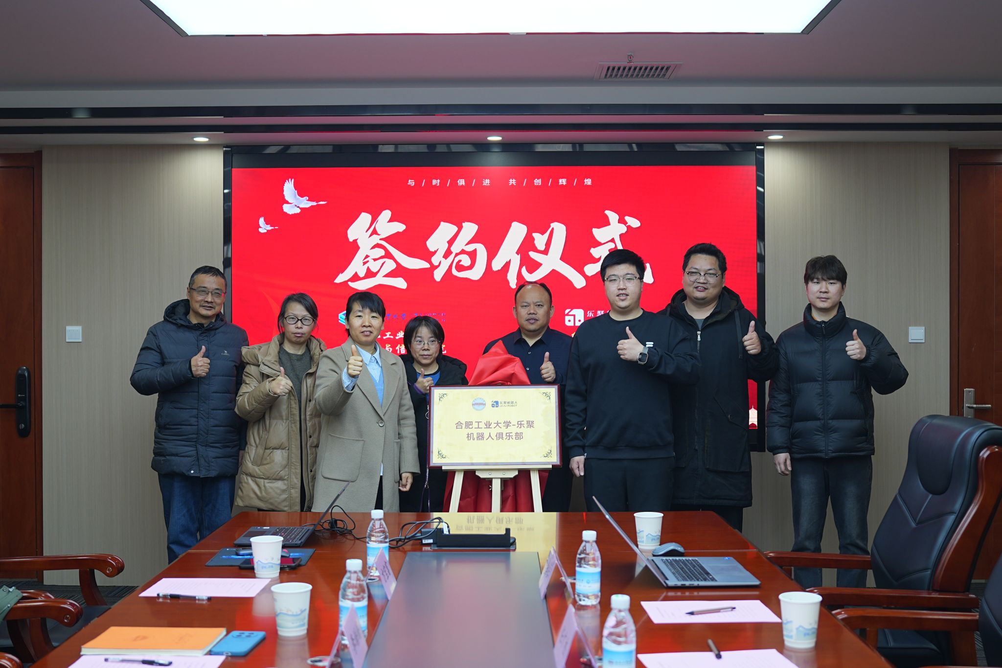 仪式伊始,主持人李培培教授介绍了双方出席人员。随后,双方领导分别致辞,表达了推动产学研深度融合、共同培育高素质创新人才的愿景与信心。双方就联合俱乐部的合作方案进行了交流,在人才培养、课程建设、实习基地、科研创新等方面达成了共识。在与会人员的共同见证下,合肥乐聚机器人技术有限公司代表与学院负责人正式签署合作协议,并为联合俱乐部揭牌。仪式最后,全体参会人员合影留念。