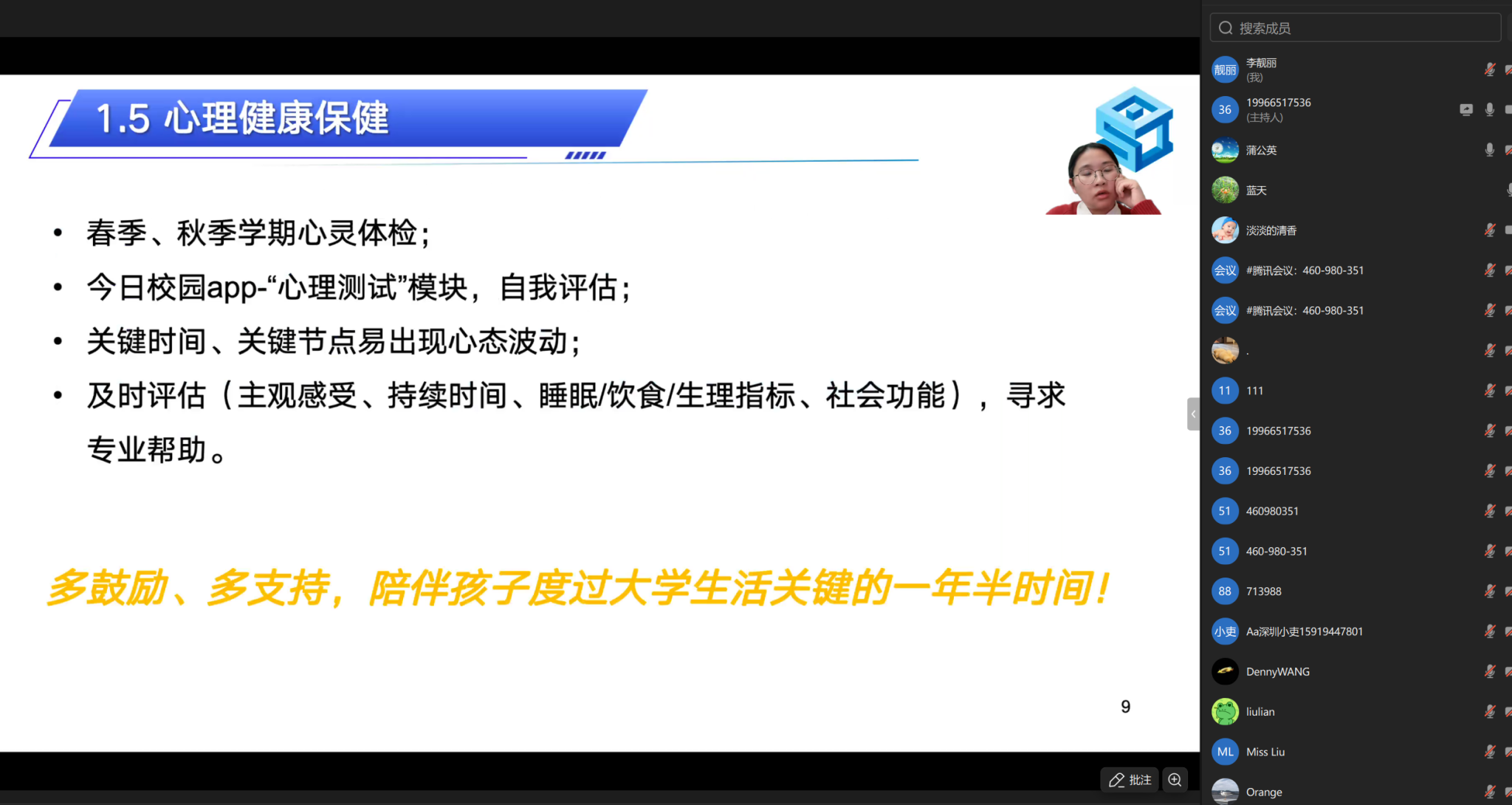 会上,辅导员结合2023级学生特点,围绕“日常安全稳定”“学业完成情况”“个人未来规划”三大板块展开分享。在日常安全稳定部分,辅导员重点强调了消防安全、离返校安全、电信诈骗防范、网络文明素养及心理健康保健等内容,结合校园案例提醒家长关注并及时沟通孩子的日常安全与心理状态;在学业完成情况部分,辅导员从学风建设、学分要求、学籍管理规定等方面,明确大学学业的核心要求,引导家长持续关注孩子的学业进度;个人未来规划环节,梳理了就业、升学、入伍等发展路径,建议家长利用假期与孩子共同明确方向,以孩子意愿为主提供建议,可以同步准备多条路径,后续动态跟踪调整。最后,设置家长提问环节,辅导员逐一细致解答,同步记录家长关注的共性问题,并提出后续将与家长保持动态联络,反馈学生的发展动态。