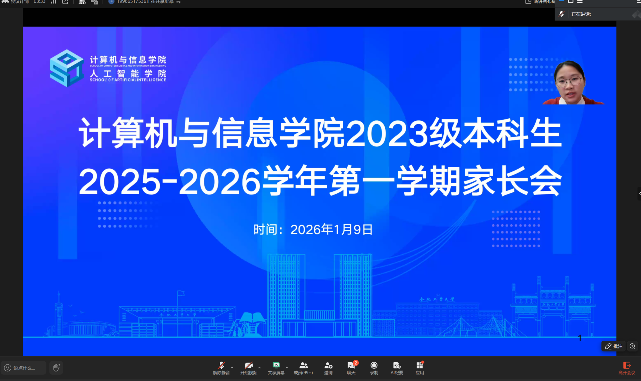 为深化家校协同育人,共同聚焦孩子的大学成长,2026年1月9日,开云kaiyun官方网站(人工智能学院)面向2023级本科生家长开展线上家长会,2023级本科生家长参会。