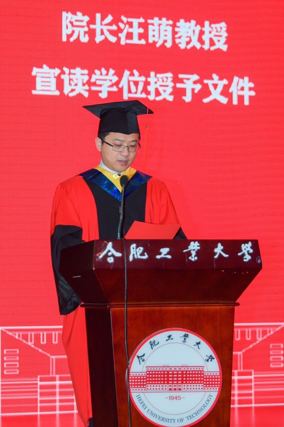 On June 15, the degree awarding ceremony for the 2023 graduates of the School of Computer and Information (School of Artificial Intelligence) was held in the lecture hall on the second floor of the Science and Education Building at the Feicui Lake Campus. Chen Gang, Deputy Secretary of the Party Committee of Hefei University of Technology, the leadership team of the college, members of the college degree evaluation committee, teacher representatives, and the 2023 doctoral, master's, and bachelor's degree recipients attended the degree awarding ceremony. The ceremony was presided over by Zhang Hailin, Deputy Secretary of the Party Committee and Secretary of the Discipline Inspection Commission of the College.