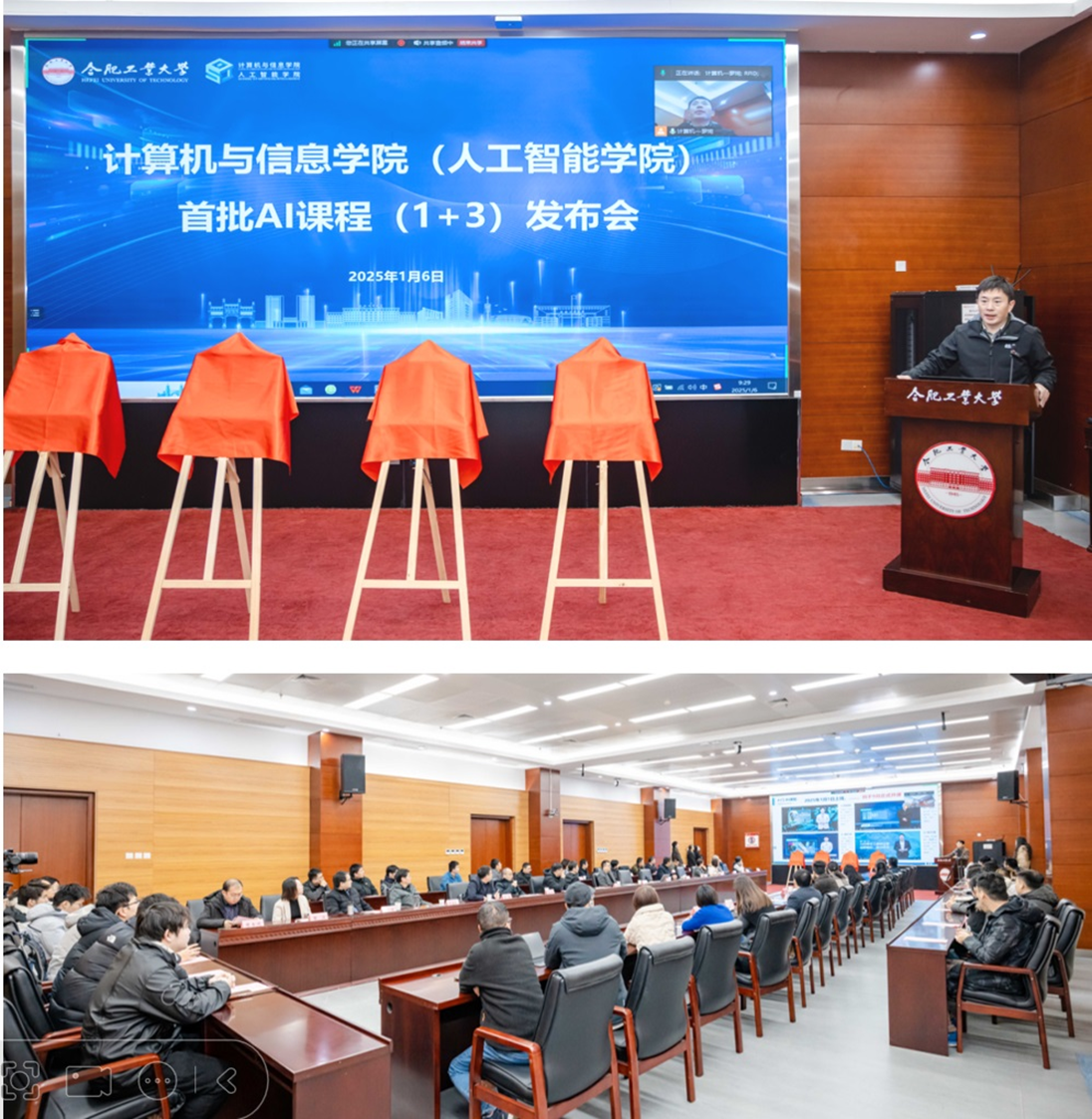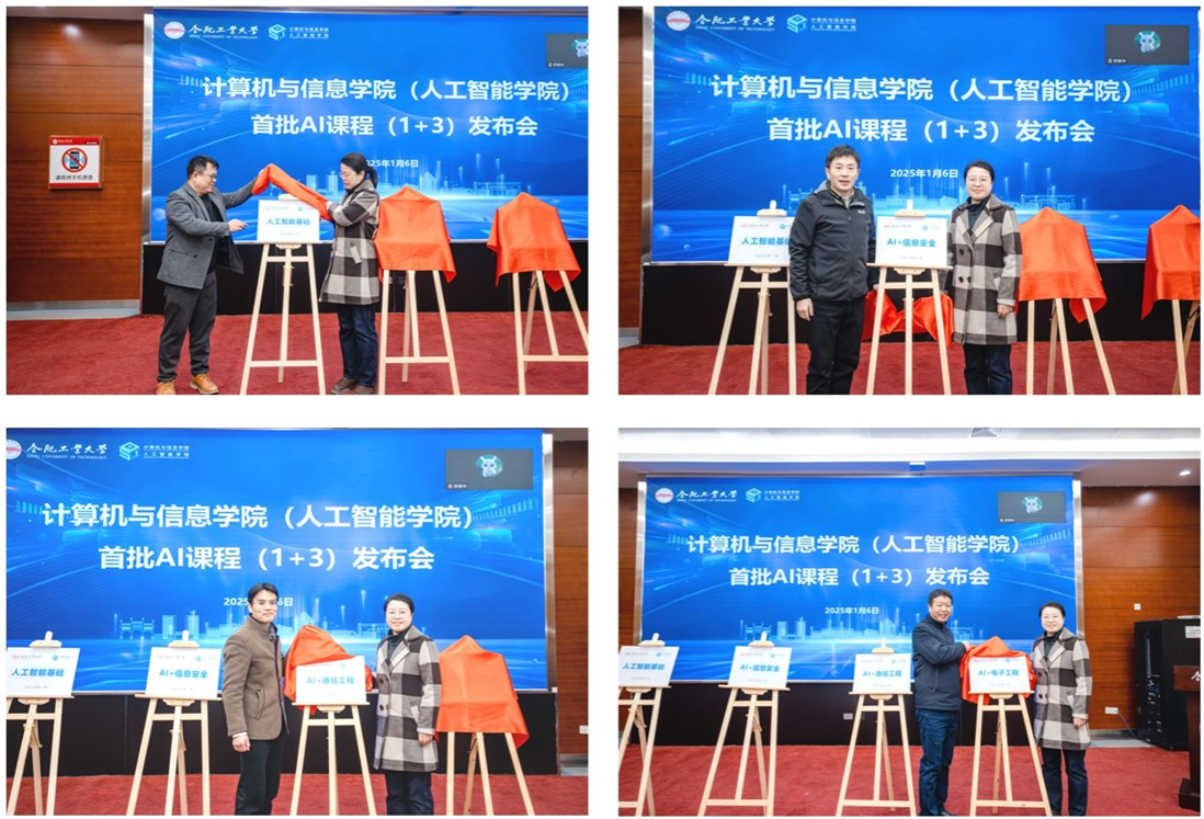 At the launch event, Xia Na, Deputy Dean of Teaching at our school, first introduced the development of the first batch of four AI courses. Subsequently, a promotional video for the "Fundamentals of Artificial Intelligence" general education course was played, and an unveiling ceremony was held for the four AI courses. Finally, Dean Zhang Li and Deputy Dean Zhang Yi of Academic Affairs delivered guiding speeches respectively. Dean Hong Richang thanked the Academic Affairs Office for their support in our school's teaching reform efforts and called on everyone to innovate on the track of AI-empowered higher education, continuously improve the content and quality of AI courses, and contribute to the high-quality development of AI education at our university.