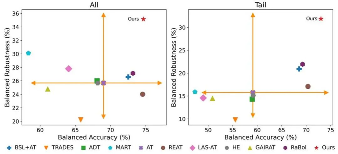 Figure 2. The evaluation includes both balanced accuracy and robustness, comparing long-tail recognition methods, adversarial training, state-of-the-art defenses, and our proposed approach. The results demonstrate that our method outperforms the others in both balanced accuracy and performance on weak classes.