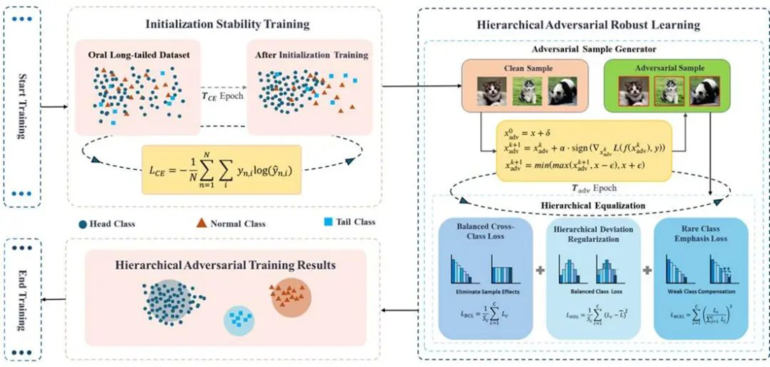 Figure 1. The TAET framework includes an Initial Stabilization Module (upper left) and the HARL module (right). The Initial Stabilization Module, based on cross-entropy loss, aims to stabilize accuracy in early training and transfers the trained model to HARL. Our HARL module consists of three components: BCL, HDL, and RCEL. A multi-step generation process creates perturbations (upper right), which are processed by normalization components (lower right).