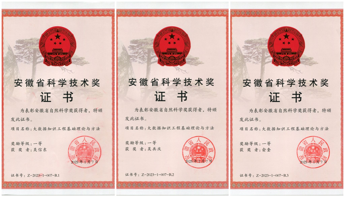 The project "Basic Theories and Methods of Big Data Knowledge Engineering" declared by Professor Wu Xindong, Professor Wu Gongqing and Professor Yu Kui of our school won the First Prize of Natural Science Award, which is a major progress made by our school in the field of basic research.